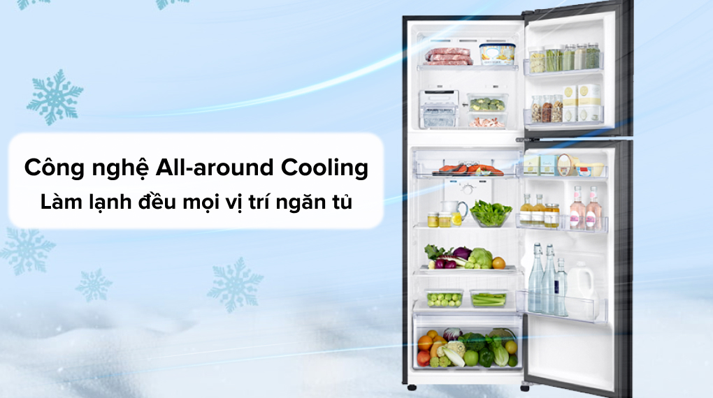 Công nghệ All-around Cooling nên hơi lạnh thổi ra theo hình vòng cung nhờ đó khí lạnh được thổi đến mọi ngóc ngách trong từng ngăn tủ giúp duy trì nhiệt độ và độ ẩm luôn ổn định, đảm bảo thực phẩm tươi ngon, mọng nước.