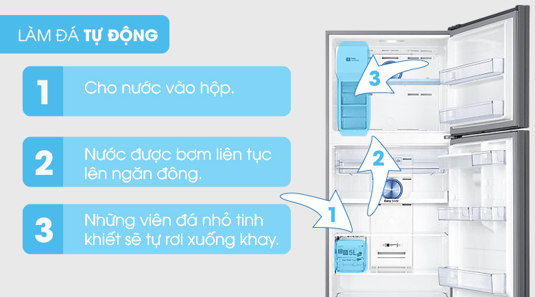 Làm đá tự động: Bạn chỉ việc cho nước vào khay chứa, tủ lạnh sẽ tự động làm ra những viên đá mát lạnh, tinh khiết cho món giải khát của bạn.