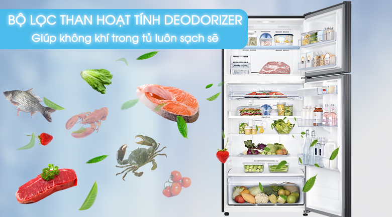 Nhờ than hoạt tính mà tủ lạnh 2 cửa này có thể loại trừ nhanh chóng các mùi khó chịu từ thức ăn phát sinh trong tủ. Giúp bạn yên tâm bảo quản thực phẩm bên trong an toàn cho sức khỏe.