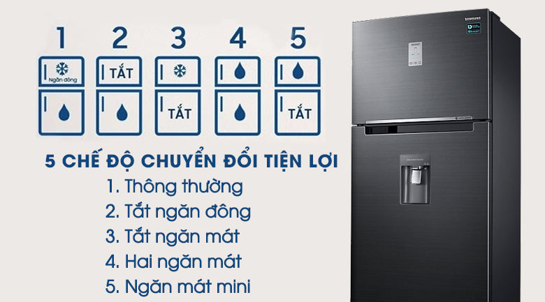 Hai dàn lạnh của tủ lạnh Samsung Inverter này có thể chuyển đổi chế độ qua lại theo 5 chế độ khác nhau. Điều này góp phần cho hai hệ thống được làm lạnh phù hợp với lượng thức ăn và nhu cầu của người dùng, mà không tiêu tốn quá nhiều điện năng.