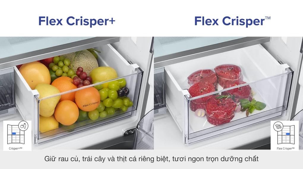 Hộp trái cây, rau củ kín khí Crisper+ bảo toàn độ ẩm lên đến 70% giúp giữ thực phẩm được lâu hơn và nguyên vị như ban đầu. Hộp thịt cá Flex Crisper với nhiệt độ đông mềm chuẩn -1 độ C giúp thịt cá giữ được độ tươi ngon và trọn dưỡng chất, hoàn toàn không đông đá, không cần rã đông trước khi chế biến vô cùng tiện lợi và tiết kiệm được thời gian.