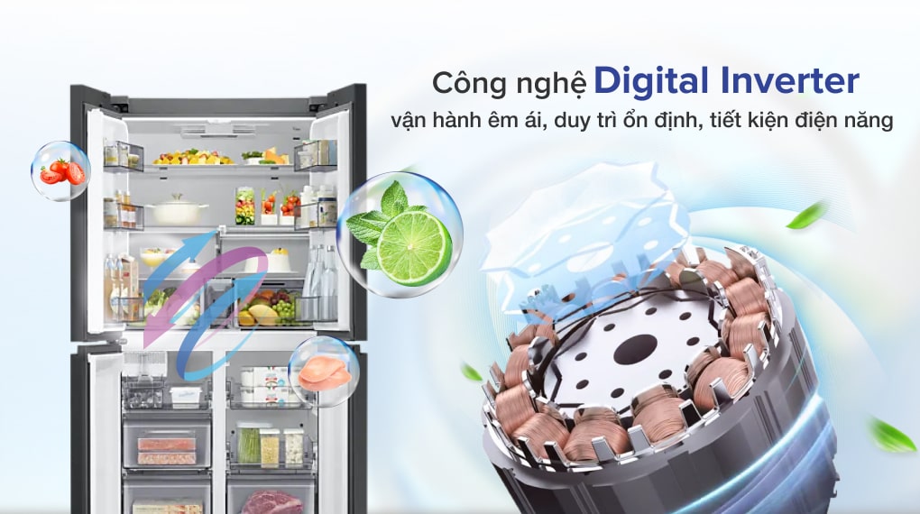 Tủ lạnh Samsung sử dụng máy nén với công nghệ Digital Inverter được vận hành tự động và có thể tùy chỉnh nhiệt độ phù hợp nhờ bảng điều khiển điện tử tiện dụng. Điều này giúp cho nhiệt độ bên trong tủ luôn được ổn định, hoạt động hiệu quả, tiết kiệm điện năng, hạn chế tiếng ồn và nâng cao tuổi thọ của máy.