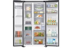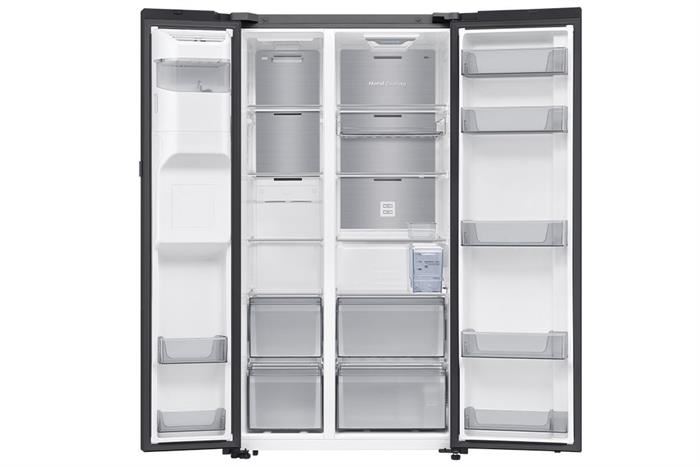 Tủ lạnh Side by Side Samsung RS80F65J2BSV nổi bật với thiết kế Side By Side hai cánh rộng rãi, phủ lớp hoàn thiện màu bạc ánh kim (Stainless Steel) cao cấp, mang lại vẻ đẹp tinh tế và hiện đại. Tay nắm ẩn được tích hợp khéo léo vào thân tủ, tạo nên bề mặt phẳng mượt mà, không chỉ thẩm mỹ mà còn dễ lau chùi, giữ cho tủ luôn sáng bóng như mới.