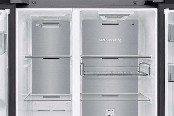 – Công nghệ Metal Cooling trên Samsung Inverter 634 lít Side By Side RS80F65J2BSV giúp bảo toàn nhiệt độ, giảm thời gian phục hồi lại nhiệt độ trong tủ sau khi mở ra và đóng lại; và còn có khả năng giữ lạnh trong trường hợp bị mất điện giúp bạn tiết kiệm điện năng vô cùng hiệu quả.