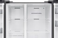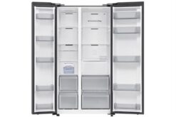 Tủ lạnh Side by Side Samsung RS70F65Q3FSV nổi bật với thiết kế Side By Side hai cánh rộng rãi, phủ lớp hoàn thiện màu bạc ánh kim (Stainless Steel) cao cấp, mang lại vẻ đẹp tinh tế và hiện đại. Tay nắm ẩn được tích hợp khéo léo vào thân tủ, tạo nên bề mặt phẳng mượt mà, không chỉ thẩm mỹ mà còn dễ lau chùi, giữ cho tủ luôn sáng bóng như mới.