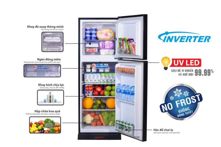 Tủ lạnh Sanaky VH-269KD có đèn UV khử mùi diệt khuẩn, giữ thực phẩm tươi ngon và an toàn khi sử dụng. Khay kính chịu lực bền và sang trọng.