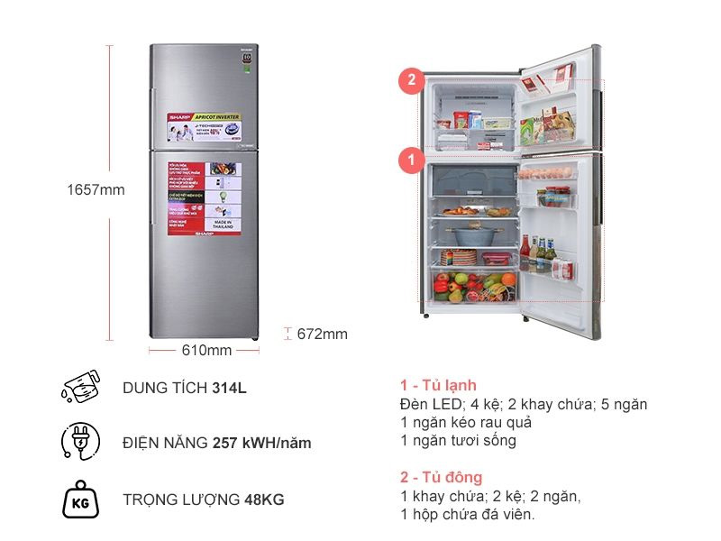 Tủ lạnh Sharp dung tích tủ lớn 287 lít, đáp ứng nhu cầu sử dụng, chứa đựng thực phẩm cho gia đình có 5-7 thành viên với thiết kế hiện đại, sang trọng.