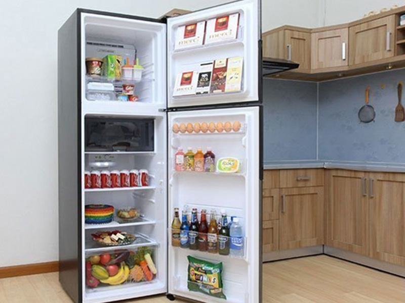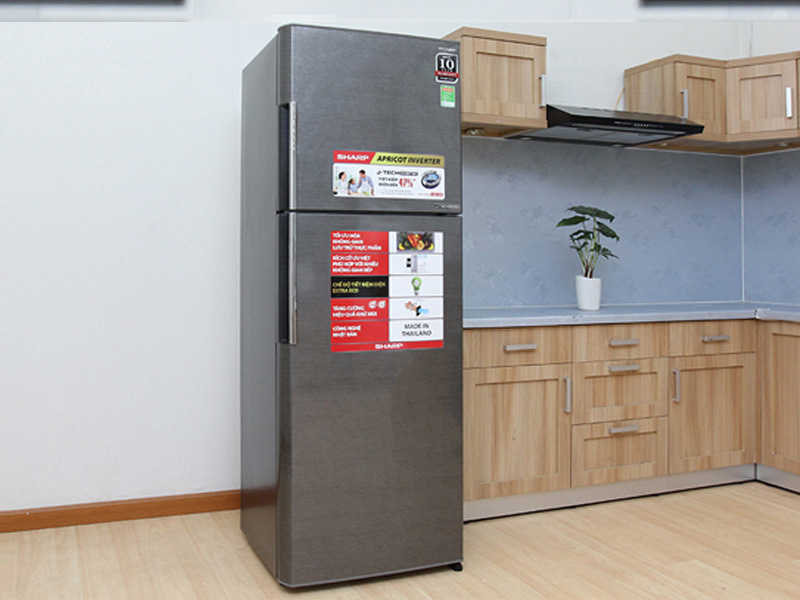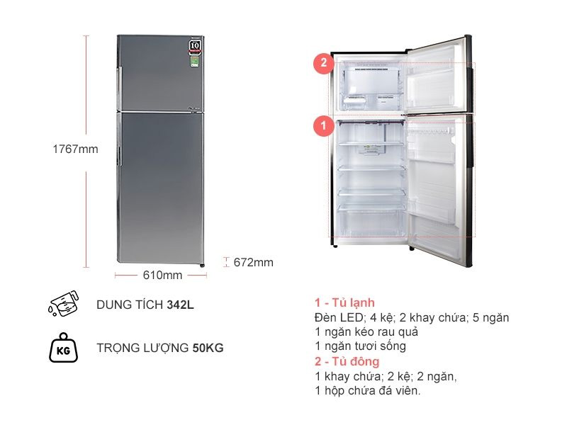 Tủ lạnh Sharp thiết kế hiện đại, tông màu bạc sang trọng, sạch sẽ. Dung tích tủ lớn 342 lít, đáp ứng nhu cầu sử dụng cho gia đình có 5-7 thành viên.