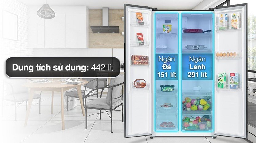 Dung tích sử dụng 442L đáp ứng nhu cầu sử dụng cho gia đình 3-5 người