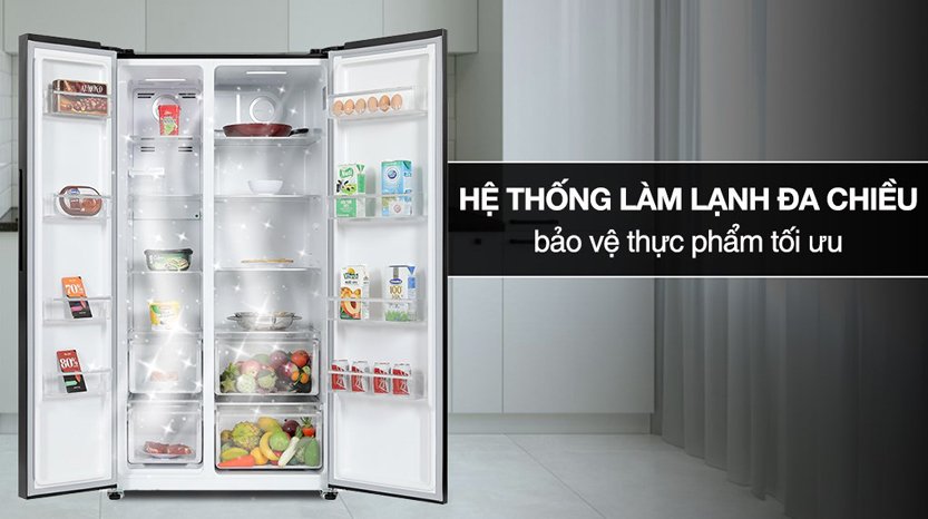 Công nghệ làm lạnh đa chiều: Công nghệ này sẽ lan tỏa đều hơi lạnh khắp mọi ngăn tủ, giúp thực phẩm được làm lạnh toàn diện để giảm thiểu tình trạng hư hỏng, đồng thời kéo dài thời gian bảo quản lâu hơn.