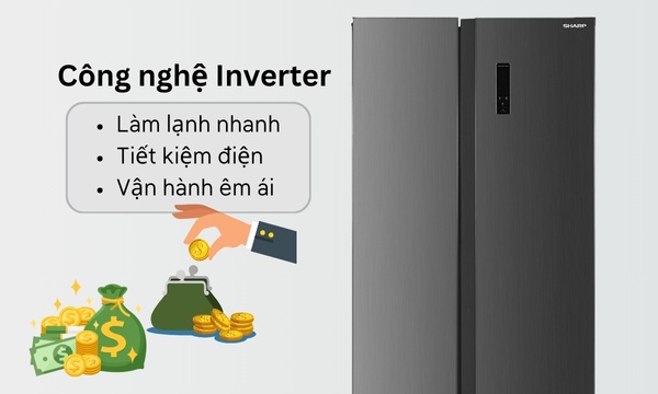 Sở hữu chiếc tủ lạnh Sharp trang bị công nghệ Inverter này, chị em nội trợ sẽ giảm bớt đi những nỗi lo hóa đơn tiền điện mỗi tháng. Bởi tủ ứng dụng công nghệ Inverter không những giúp làm lạnh nhanh mà còn tiết kiệm điện năng, giảm thiểu tiếng ồn và giảm hao mòn động cơ để kéo dài tuổi thọ cho máy.
