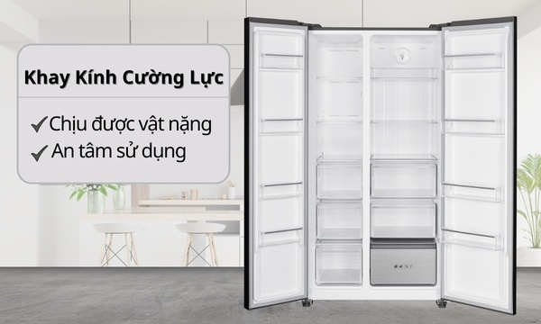 Tủ lạnh được trang bị hệ thống khay đựng được làm từ chất liệu kính cường lực vững chắc. Điều này giúp bạn dễ dàng bảo quản nhiều loại trái cây và bình chứa nặng mà không lo lắng về việc ảnh hưởng đến độ bền của kệ.