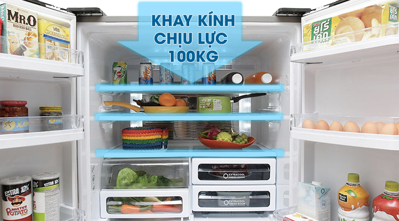 Trang bị khay kính chịu lực lên đến 100 kg của tủ lạnh Sharp SJ-FX630V-ST, bạn hoàn toàn yên tâm chất thực phẩm lên trên mà không cần phải lo lắng về trọng lượng quá nặng của thực phẩm.