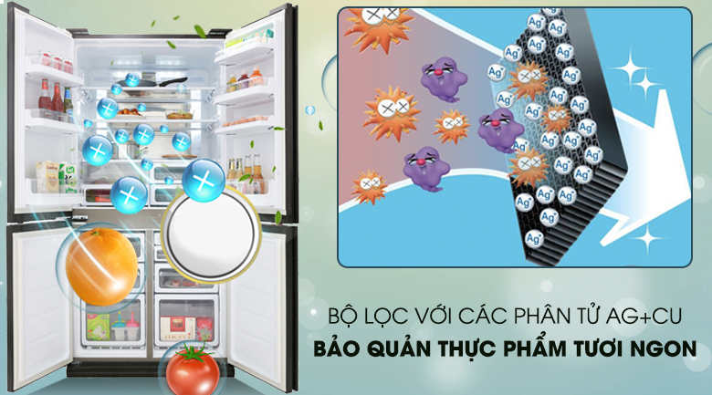 Dòng khí lạnh trên chiếc tủ lạnh Sharp Inverter này luân chuyển trong tủ đi qua bộ lọc khử mùi Bạc Đồng sẽ được lọc sạch vi khuẩn, mùi hôi và giữa không cho chúng phát triển trở lại, tạo môi trường an toàn để bảo quản thực phẩm tươi ngon cho bạn.