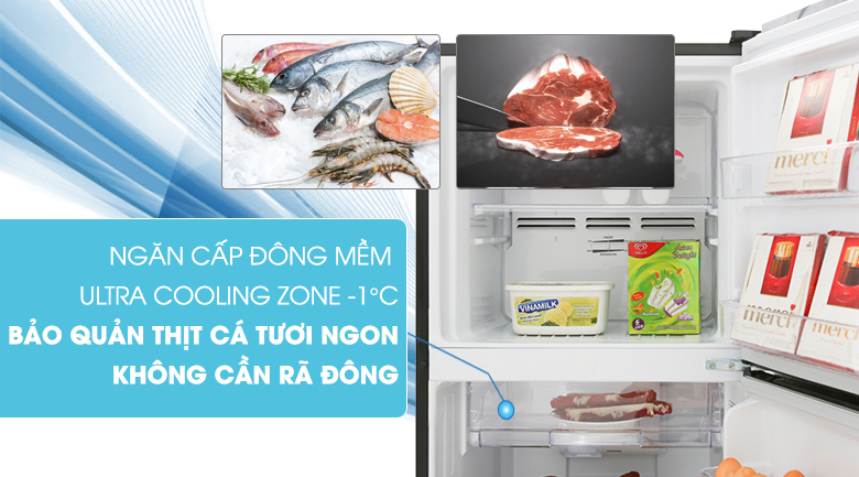 Được trang bị thêm ngăn cấp đông mềm Ultra Cooling Zone, tủ lạnh cho phép bạn bảo quản thịt, cá ở nhiệt độ -1 độ C mà không lo sợ chúng bị đóng băng. Đảm bảo cho những món ăn của bạn luôn tươi ngon, trọn vẹn hương vị và dưỡng chất, đồng thời bạn sẽ không còn phải tốn quá nhiều thời gian chờ rã đông để chế biến.