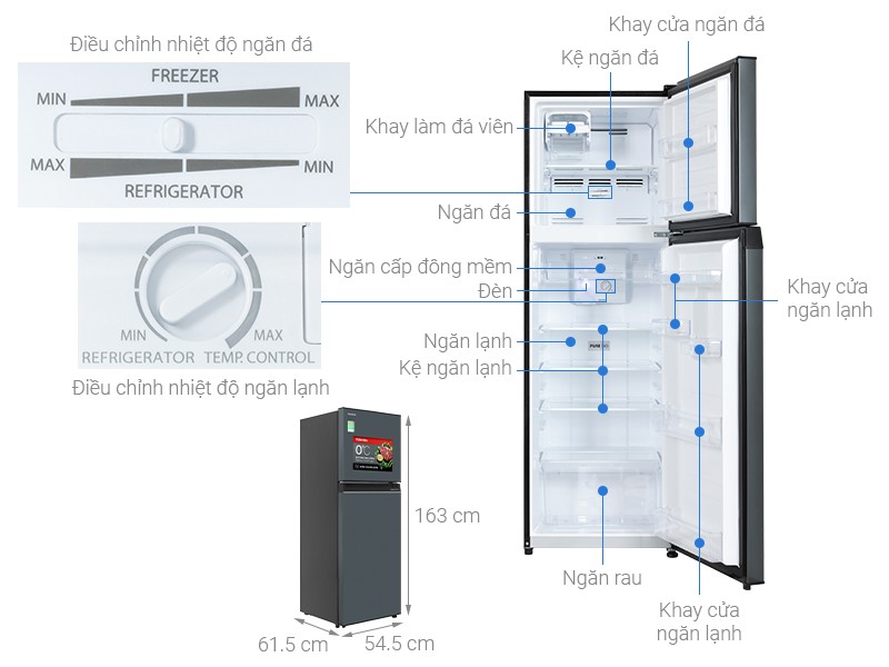 – Ngăn đá có dung tích lớn 61 lít, được thiết kế 1 kệ chia làm 2 ngăn, 1 hộp làm đá và 2 khay chứa nằm ở bên cánh cửa tủ lạnh.