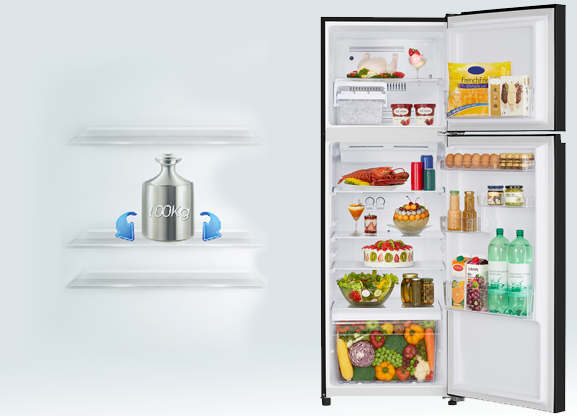 Tủ lạnh Toshiba với thiết kế ngăn kệ được làm từ kính chịu lực, nhờ vậy, tủ lạnh có khả năng chịu được sức nặng lớn, giúp người dùng dễ dàng lưu trữ được nhiều thực phẩm mà không cần phải quá lo lắng về hiện tượng khay tủ lạnh bị vỡ, nứt.