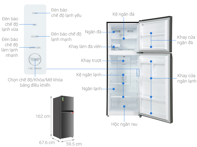 Dung tích ngăn lạnh 228 lít. Không gian bên trong gồm có 1 hộc kéo, 2 kệ chia làm 3 ngăn và 1 ngăn rau củ quả. Ngoài ra, bên cánh cửa tủ lạnh còn được thiết kế 5 khay chứa tiện lợi.