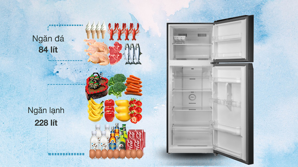 – Sản phẩm có dung tích sử dụng 312 lít, đáp ứng nhu cầu bảo quản thực phẩm tối ưu cho các hộ gia đình từ 3 – 4 người.