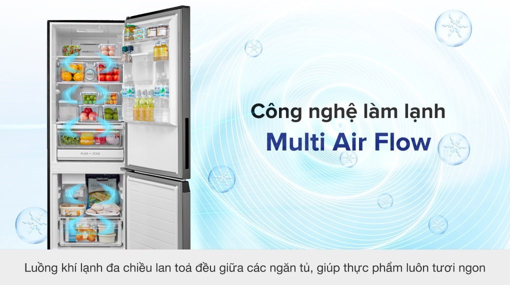 – Luồng khí lạnh đa chiều Multi Air Flow: đưa khí lạnh từ các cửa thoát hơi lạnh tỏa đều đến mọi góc trong tủ, giữ cho nhiệt độ tủ đồng đều, duy trì thực phẩm tươi ngon hiệu quả.