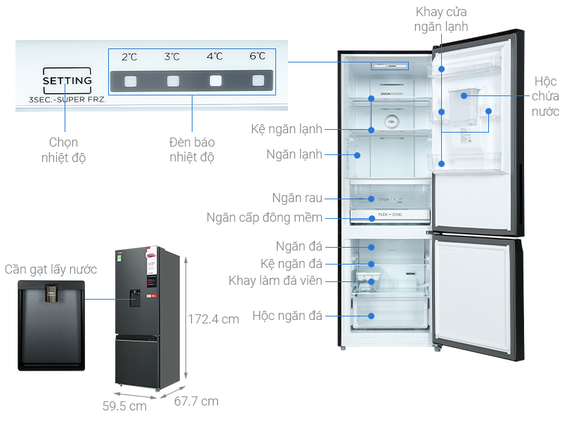 • Kích thước tủ lạnh:Cao 172.4 cm – Rộng 59.5 cm – Sâu 67.7 cm – Nặng 59 kg