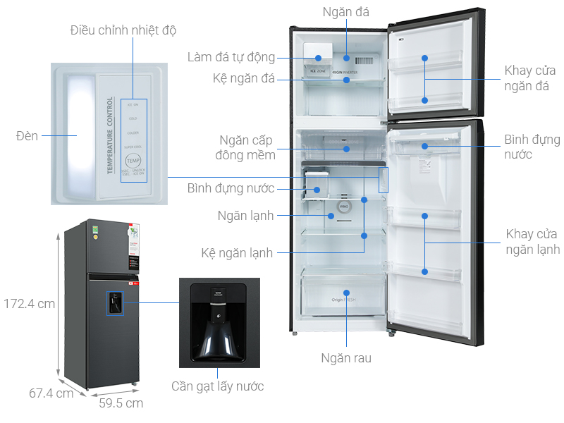 • Kích thước tủ lạnh: Cao 172.4 cm - Rộng 59.5 cm - Sâu 67.4 cm - Nặng 63 kg
