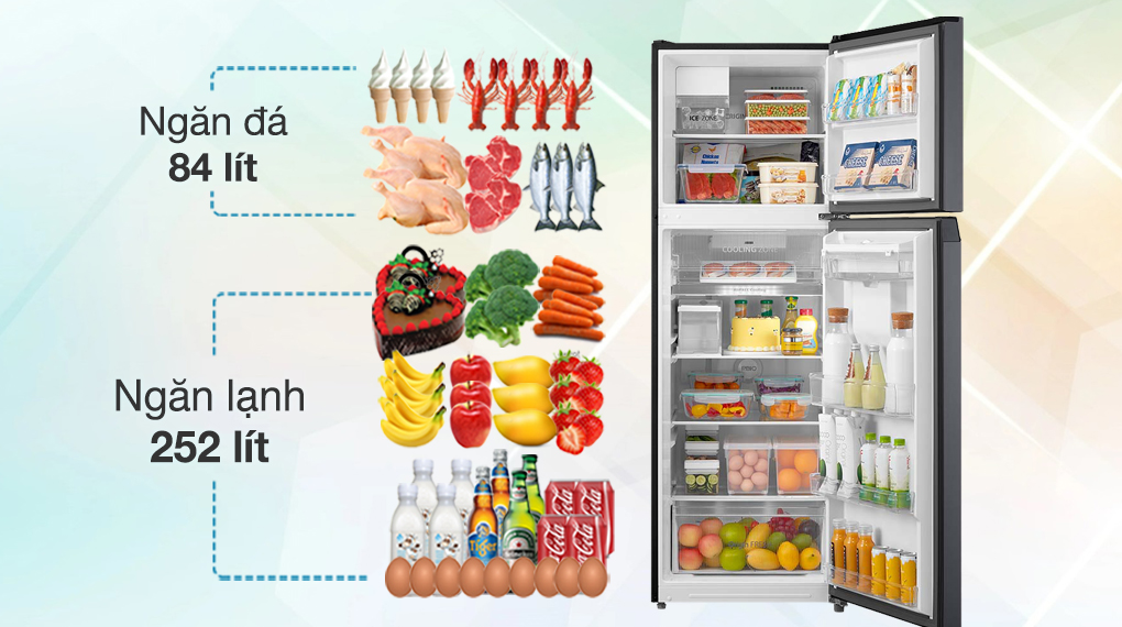 – Với dung tích sử dụng 336 lít, tủ lạnh đáp ứng tốt nhu cầu lưu trữ thực phẩm cho các hộ gia đình từ 3 – 4 người.