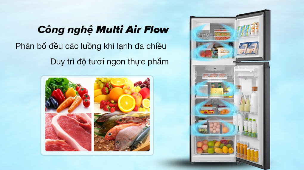 – Công nghệ làm lạnh đa chiều Multi Air Flow: Giúp phân bổ luồng khí lạnh từ các cửa thoát hơi lạnh, lan tỏa đều bên trong ngăn tủ lạnh, từ đó giảm thiểu được tình trạng thực phẩm bị hư hỏng do không đủ độ lạnh trong suốt thời gian bảo quản.