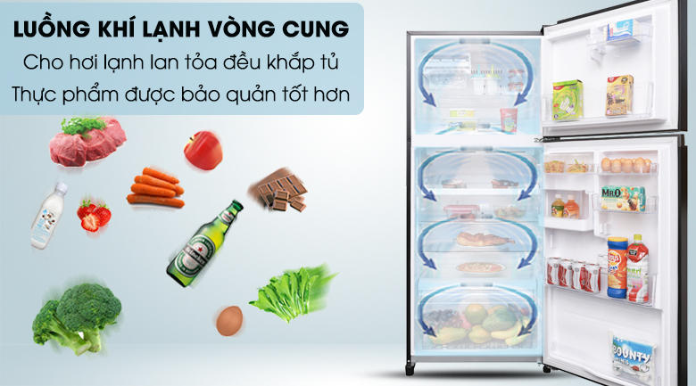 Khi sử dụng chiếc tủ lạnh Toshiba này, bạn sẽ hoàn toàn yên tâm khi thực phẩm được làm lạnh đồng đều và hiệu quả ngay cả khi tủ không còn chỗ trống nhờ vào công nghệ luồng khí lạnh vòng cung hiện đại.