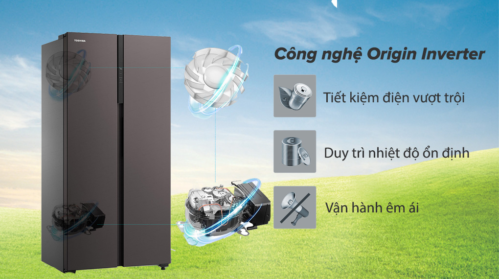 Công nghệ Origin Inverter: Kết hợp máy nén Inverter và quạt Inverter, cung cấp hơi lạnh liên tục, tỏa đều và ổn định bên trong các ngăn tủ lạnh, đồng thời giúp cho tủ lạnh có khả năng vận hành êm ái và sử dụng tiết kiệm điện tối ưu.