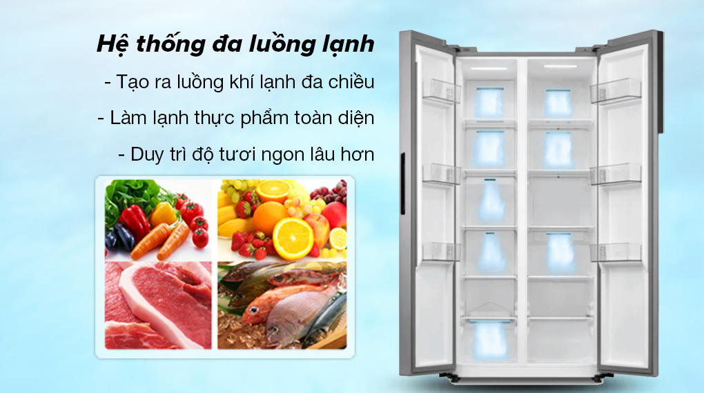 – Hệ thống đa luồng lạnh: Được thiết kế 7 hộc gió bên ngoài ngăn lạnh và ngăn đông cùng với 1 hộc gió nằm ở ngăn kéo bên trong ngăn đông, có khả năng tạo ra luồng khí lạnh đa chiều, giúp làm lạnh thực phẩm nhanh chóng nhất có thể, nhờ đó duy trì được độ tươi ngon của thực phẩm tốt hơn.