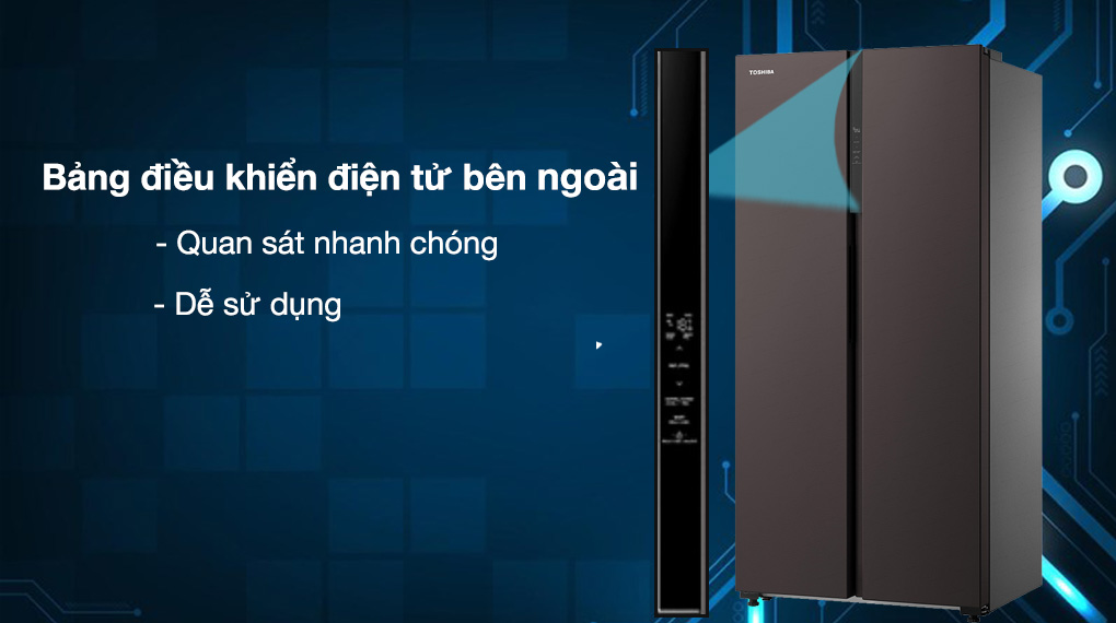 Bảng điều khiển điện tử được bố trí bên ngoài tủ lạnh Toshiba Inverter, nằm trên tay cầm phía trên của ngăn mát, giúp người dùng dễ quan sát và điều khiển thuận tiện.