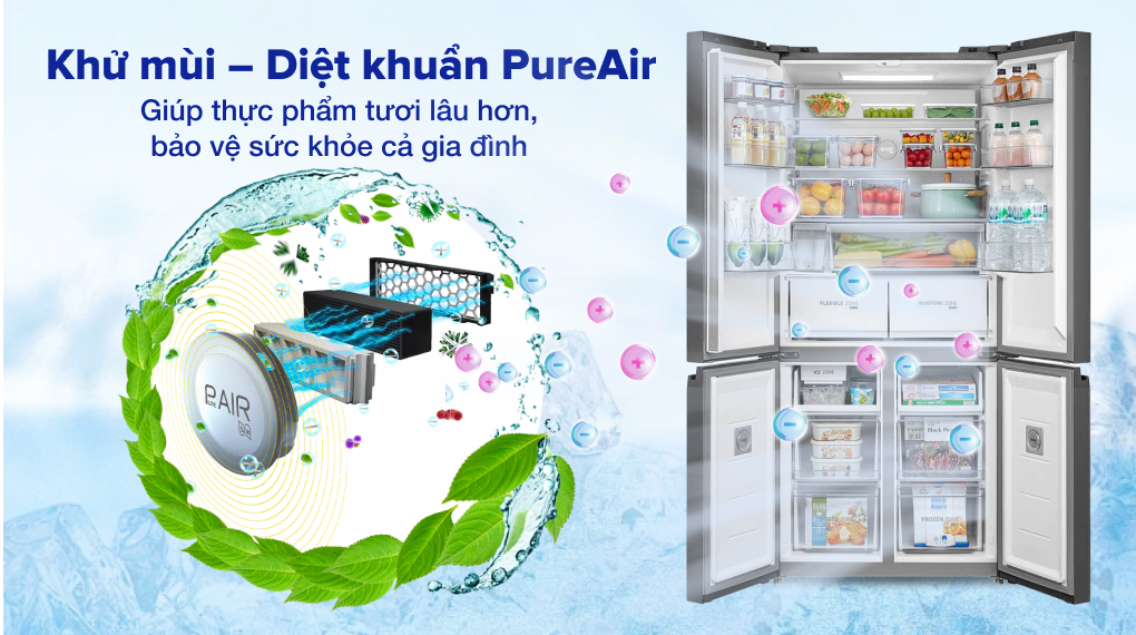 – PureAir tạo các plasma ion giúp kháng khuẩn đến 99.99%, khử sạch mùi hôi khó chịu bên trong tủ lạnh.