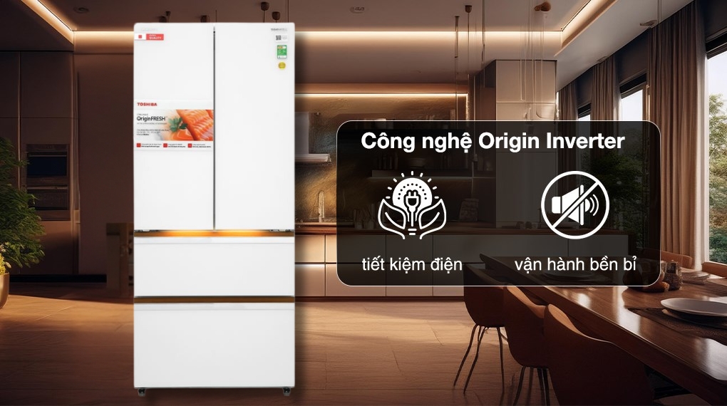 – Tủ lạnh Toshiba được trang bị công nghệ Origin Inverter giúp tiết kiệm điện năng, duy trì nhiệt độ ổn định, máy vận hành êm ái, giảm thiểu tiếng ồn trong suốt quá trình hoạt động nhưng vẫn đảm bảo thực phẩm luôn được giữ ở nhiệt độ lý tưởng, rau củ luôn tươi ngon.