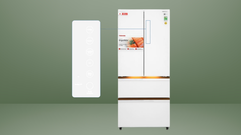 – Bảng điều khiển của tủ lạnh được thiết kế dạng cảm ứng đặt bên ngoài cửa tạo cảm giác liền mạch, người dùng tùy chỉnh các chức năng tiện lợi mà không cần mở cửa tủ nhiều lần, hạn chế việc thất thoát hơi lạnh ra bên ngoài tủ giúp tiết kiệm điện năng.
