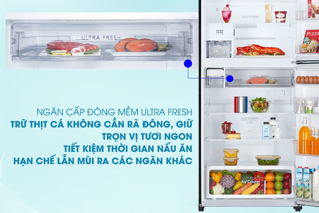 Giờ đây thịt cá bảo quản trong tủ lạnh 2 cửa này sẽ được dễ dàng hơn với ngăn cấp đông mềm Ultra Fresh, ngăn đông mềm sẽ không làm thịt cá đóng băng như ngăn đá, có thể lấy ra chế biến ngay mà không cần rã đông, với nhiệt độ đông mềm – 3 độ C giúp thịt cá giữ nguyên được dưỡng chất và hương vị ban đầu.