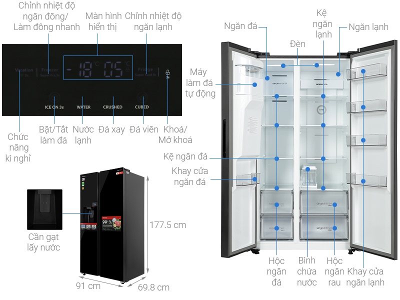 – Lấy đá bên ngoài: Tủ lạnh có khả năng làm đá tự động, thậm chí bạn có thể lấy đá bên ngoài mà không cần phải mở cửa tủ, từ đó hỗ trợ thao tác lấy đá nhanh chóng mỗi khi bạn thưởng thức các đồ uống yêu thích.