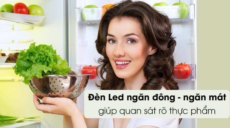 Mỗi khi mở cửa tủ lạnh, bạn chẳng cần lo lắng việc tìm kiếm thực phẩm khó khăn ra sao, vì trong ngăn đông lẫn ngăn mát đều được trang bị hệ thống đèn Led chiếu sáng.
