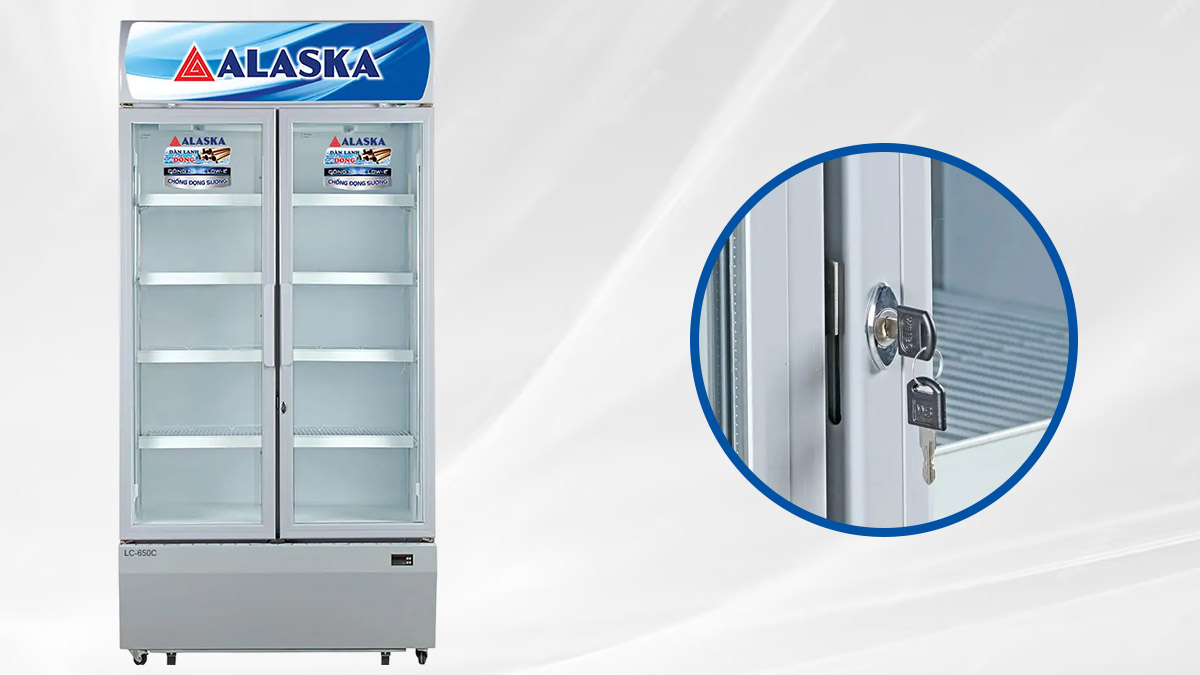 Khóa an toàn giúp ngăn chặn việc mở tủ thường xuyên, làm thất thoát nhiệt và giảm hiệu quả làm lạnh. Tủ mát Alaska có khóa an toàn giúp người dùng kiểm soát hoạt động mở và đóng tủ mát một cách hiệu quả, từ đó bảo quản thực phẩm hiệu quả và tiết kiệm điện năng.