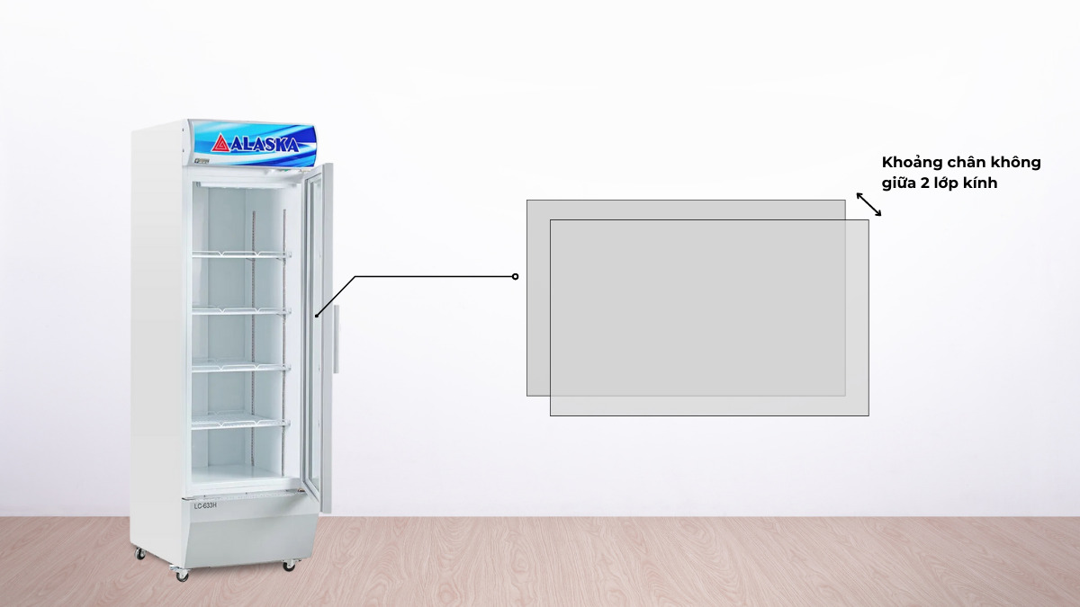 Cửa của chiếc tủ mát Alaska này được thiết kế khá đặc biệt với 2 lớp kính có khả năng chống đọng sương. Cụ thể ở giữa hai lớp kính này là được hút chân không nên lớp kính bên ngoài cũng hạn chế tình trạng đọng sương làm khuất tầm nhìn của người dùng.