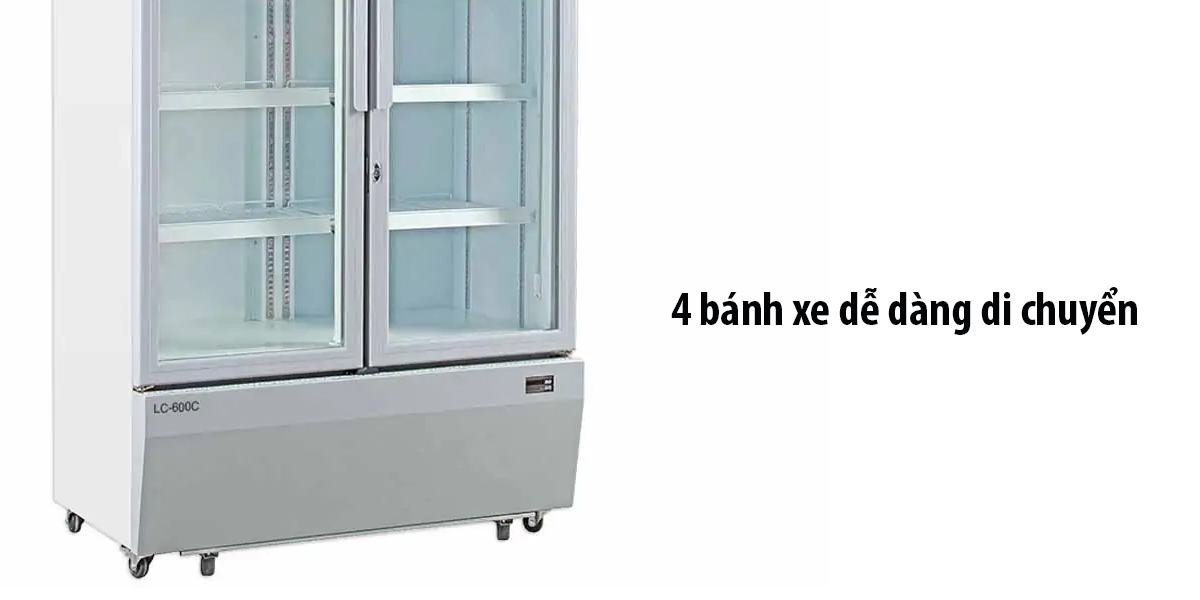 Tủ mát được trang bị 4 bánh xe, 2 bánh trước có khóa