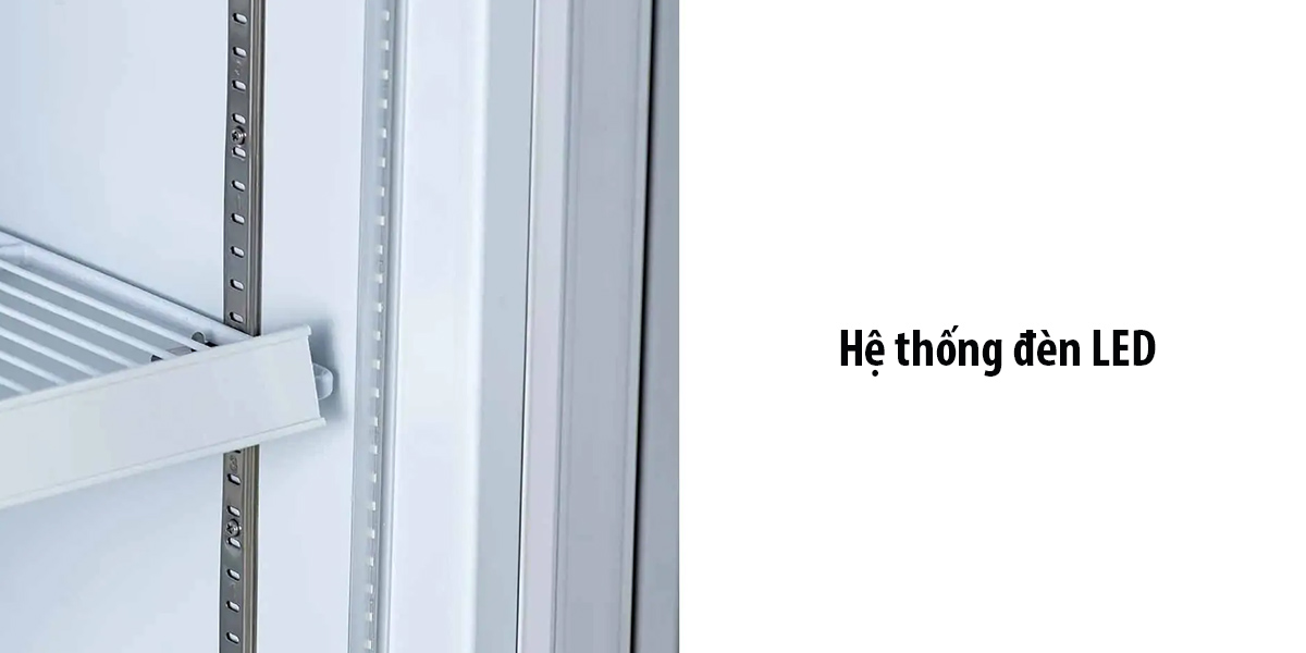 Sản phẩm đi kèm với một hệ thống đèn LED hiện đại. Đèn LED không chỉ giúp tạo ra ánh sáng sáng sủa mà còn tiết kiệm năng lượng hơn so với loại đèn truyền thống. Hệ thống đèn LED này giúp bạn dễ dàng tìm kiếm thực phẩm bên trong tủ mát và làm cho không gian nội thất tủ mát trở nên bắt mắt hơn.
