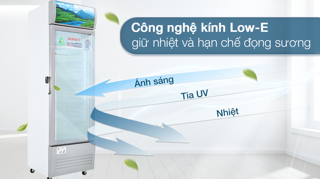 Tủ mát Sanaky 200 lít TM.VH258KL được trang bị công nghệ kính Low-E có khả năng phản xạ nhiệt, ngăn chặn tia cực tím làm ảnh hưởng đến thực phẩm bảo quản trong tủ. Ngoài ra, cửa tủ còn có khả năng hạn chế đọng sương trên cánh tủ, giúp dễ dàng quan sát thực phẩm bên trong.