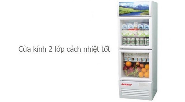 Hai cửa kính của tủ mát Sanaky VH-308W 240 lít được thiết kế dày đến 2 lớp, có độ bền cao, trong suốt giúp người dùng dễ dàng thấy và lấy thức uống cần sử dụng. Cửa kính 2 lớp được hút chân không và kết hợp hệ thống sưởi kính hiện đại ngăn không cho hơi nước đọng lại trên cửa kính giúp người dùng dễ thấy và lấy thức uống, trái cây bên trong tủ mát.