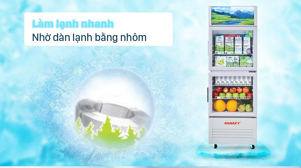 Tủ mát Sanaky được thiết kế dạng tủ đứng với 2 cánh cửa làm bằng kính có thể nhìn thấy thực phẩm bên trong. Dung tích sử dụng là 340 lít nên phù hợp cho các tiệm tạp hóa, quán nước gia đình và các siêu thị mini với nhu cầu trưng bày sản phẩm ít.