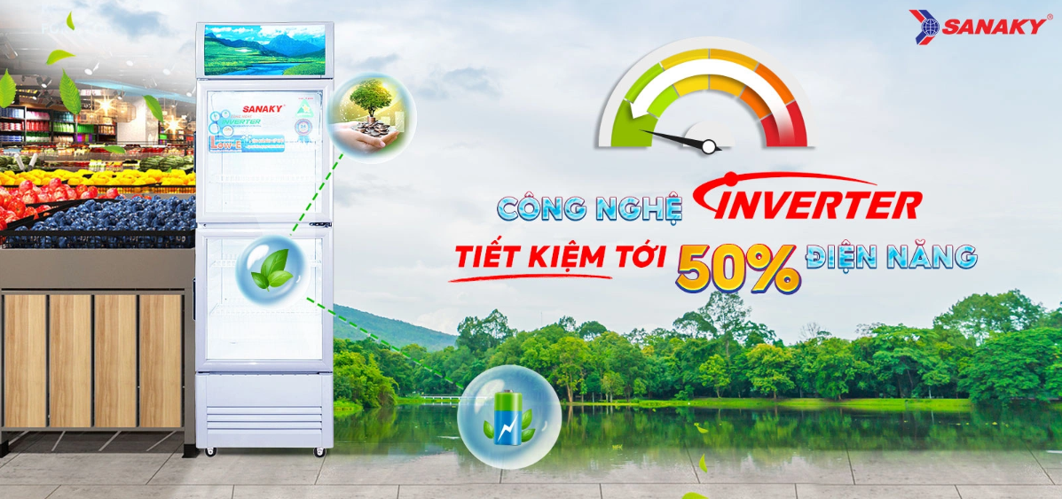 Tủ mát Sanaky inverter là dòng tủ mát được tích hợp công nghệ inverter, máy nén của tủ sở hữu công nghệ biến tần sẽ giúp tốc độ vòng quay của roto máy nén được điều khiển bằng tần số. Công nghệ biến tần dùng mạch đổi điện có thể điều chỉnh các thông số điện, từ đó điều chỉnh tốc độ quay, cơ chế vận hành của máy nén, đảm bảo với hiệu quả tối ưu nhất.