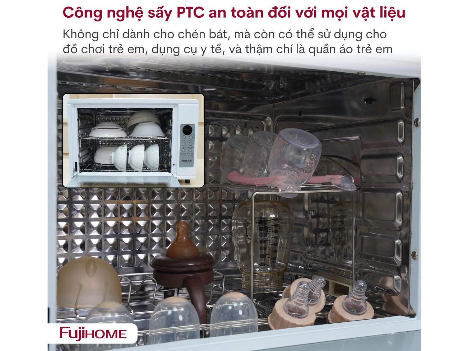 Fujihome DD38 không chỉ là thiết bị sấy khô bát đĩa mà còn phù hợp với nhiều loại vật dụng khác nhau. Bạn có thể sử dụng tủ để khử trùng và làm khô bình sữa, khăn tắm, quần áo trẻ sơ sinh, đồ chơi, dụng cụ y tế hoặc các vật dụng bằng kim loại, gỗ và thủy tinh.
