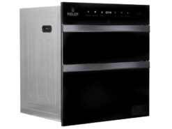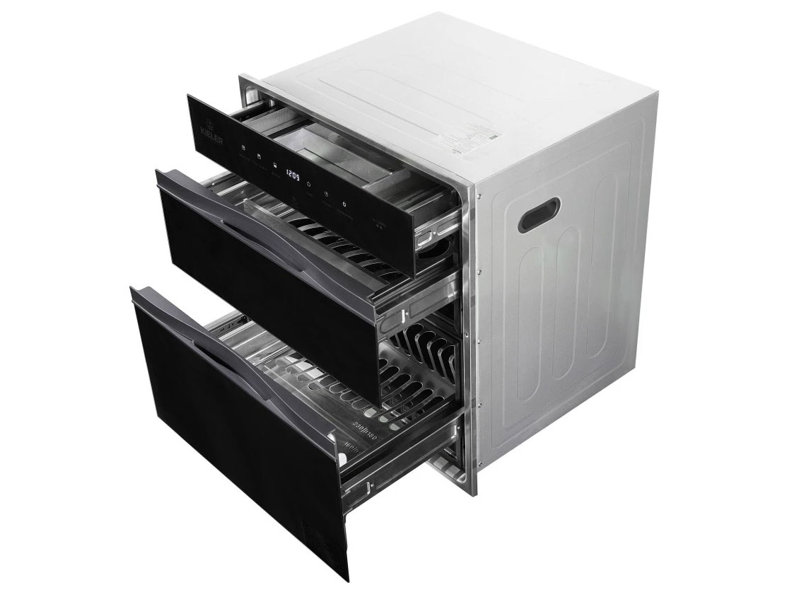 Máy tiệt trùng thiết kế dạng âm tủ nhằm tối ưu không gian nhà bếp. Tủ tiệt trùng có nhiều khay để chứa chén dĩa và ly.