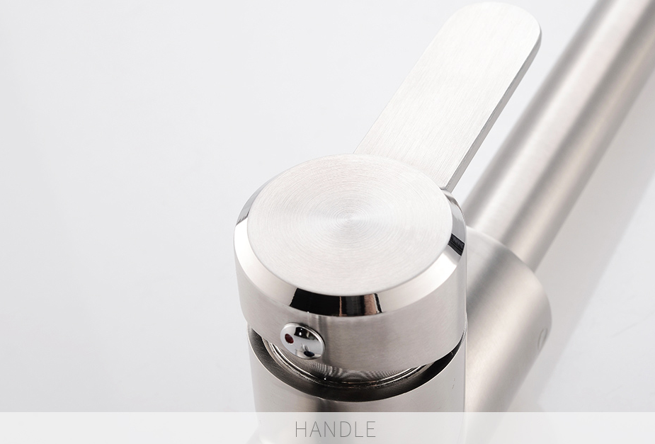 Cần gạt nước nhỏ gọn có thiết kế hình chữ L, nằm thẳng giúp tối ưu không gian bàn bếp. Tay vòi có thể xoay êm ái 90° nên rất dễ dàng để sử dụng.
