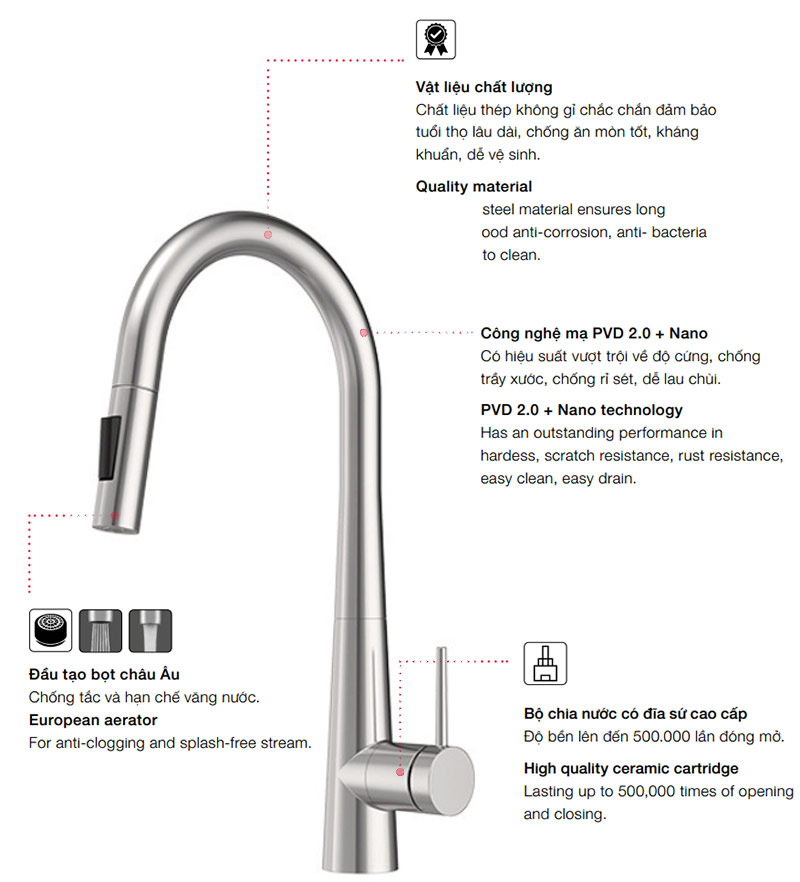 - Ứng dụng công nghệ mạ PVD 2.0 + Nano, giúp vòi rửa bát bền đẹp, chống ăn mòn, chống bám bẩn, thân thiện với môi trường.